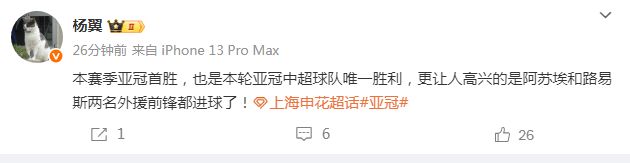 另外一位上海记者杨翼则表示,“本赛季亚冠首胜,也是本轮亚冠中超球队唯一胜利,更让人高兴的是阿苏埃和路易斯两名外援前锋都进球了!”