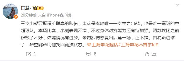上海记者甘慧则认为,除了获胜之外,申花本场比赛也是收获了诸多好消息,“三支出战亚冠精英联赛的队伍,申花是本轮唯一一支主力出战,也是唯一赢球的中超球队。本场比赛,小刘表现不错,不过身体对抗能力还有待加强。阿苏埃比之前积极了不好,体能情况有进步。米内罗伤愈复出后第一场,还不错。路易斯进球了,希望能帮助他找回竞技状态。”