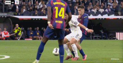 第28分钟,皇马前场右侧60度角任意球快发,姆巴佩插上拿球突入禁区小角度怒射,门将什琴斯尼奋力将球扑出。第37分钟,巴萨前场左侧高位逼抢,巴尔韦德将球传回中路,居莱尔停球停大了,佩德里上抢将球断走,巴萨这边就地反击,连续的配合,拉什福德禁区左侧策应横传中路,后排跟进的费尔明小禁区前沿迎球大力推射,皮球应声入网,巴萨1:1扳平比分。仅仅4分钟后皇马这边快速回应,维尼修斯左路硬超孔德下底传中,米利唐后点高高跃起头球摆渡顶到门前,巴萨这边防守漏人,无人防守的贝林厄姆门线前凌空将球扫入半空门,皇马2:1快速的再次取得领先。